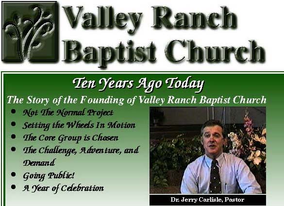 "The story of Valley Ranch Baptist Church is the account of God patiently working through faithful people to accomplish His will. It all began in the most unlikely of places...La Petite Academy, a child-care facility in the heart of Valley Ranch. On the first Sunday in May in 1986, the fellowship of people that would become Valley Ranch Baptist Church met to worship together for the very first time. A decade later and just down the road, God continues to move in a mighty way in the hearts and lives of the residents of this community through His church."